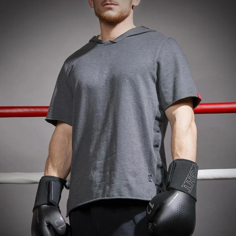 Compra en Decathlon Camiseta de boxeo manga corta con capucha Outshock 100 gris Para el practicante de boxeo que busca una sudadera de entrenamiento ligera y con un corte que garantice la libertad de movimientos.