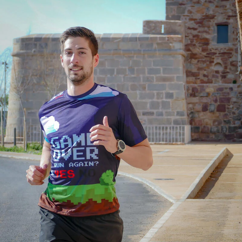 Compra en Decathlon CAMISETA DE RUNNING #GAMEOVER para HOMBRE – KAMUABU multicolor 90grs Camiseta Running Divertida. Ligera y fresca. Rápido secado. Muy transpirable. Tratamiento bacteriostático (no aparecen olores). Colores sublimados, garantizan la «viveza» después de cientos de lavados