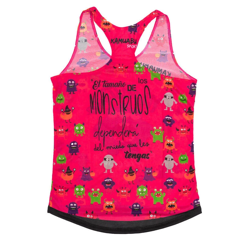 Compra en Decathlon CAMISETA DE RUNNING #MONSTRUOS para MUJER – KAMUABU color rosa de tirantes Camiseta Running Divertida. Ligera y fresca. Rápido secado. Muy transpirable. Tratamiento bacteriostático (no aparecen olores). Colores sublimados, garantizan la «viveza» después de cientos de lavados