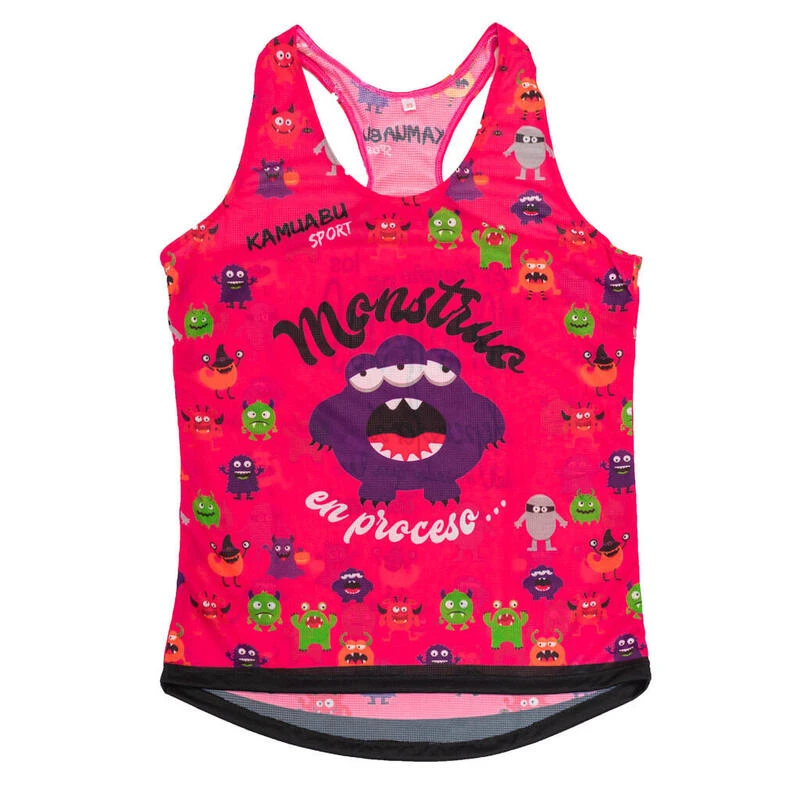 CAMISETA DE RUNNING #MONSTRUOS Para MUJER – KAMUABU Color Rosa De Tirantes