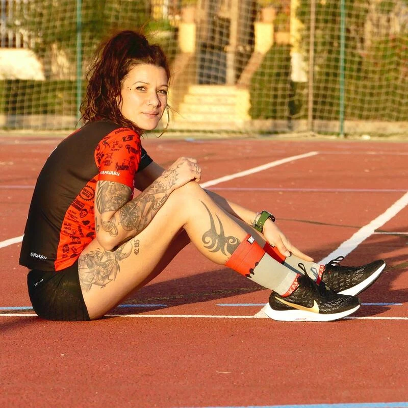CAMISETA DE RUNNING #SOYMARATON Para MUJER – KAMUABU Color ROJO/NEGRO 110grs