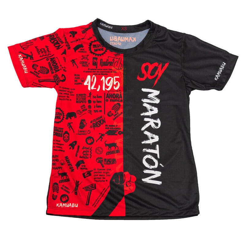 Compra en Decathlon CAMISETA DE RUNNING #SOYMARATON para MUJER – KAMUABU color ROJO/NEGRO 110grs Camiseta Running Divertida. Ligera y fresca. Rápido secado. Muy transpirable. Tratamiento bacteriostático (no aparecen olores). Colores sublimados, garantizan la «viveza» después de cientos de lavados