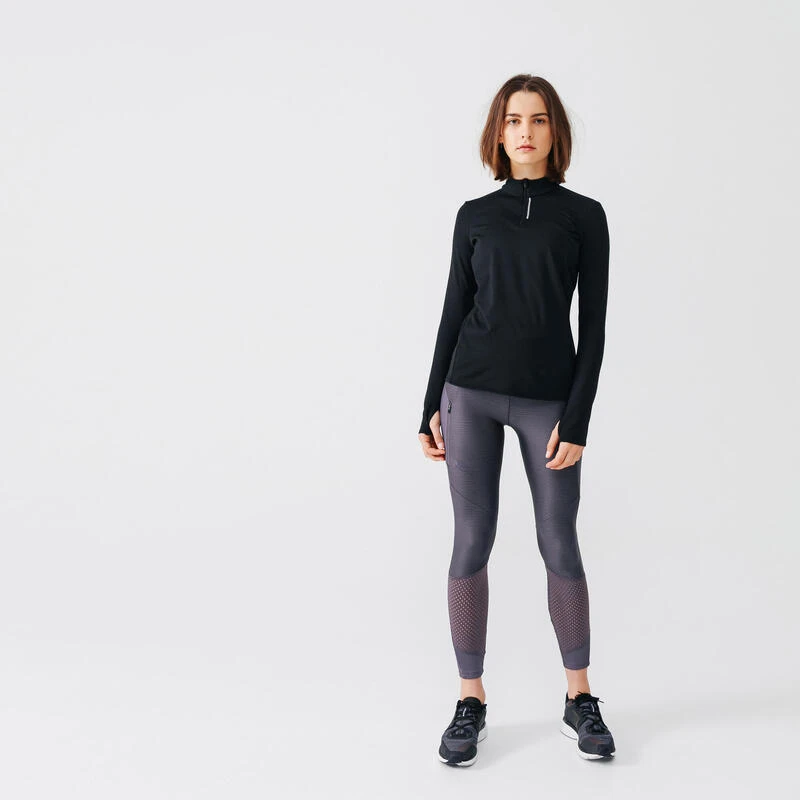 Compra en Decathlon Camiseta térmica running Mujer negra Esta camiseta térmica de mujer mantiene el cuerpo a la temperatura correcta para protegerte del frío durante la práctica del running.